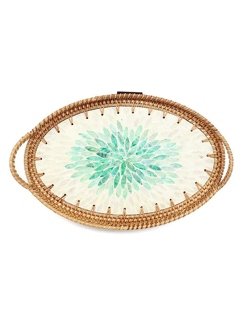 This unique fusion of natural rattan and lustrous mother of pearl inlay creates a stunning serving tray that's both functional and stylish. Perfect for serving appetizers or displaying decorative items, this rattan tray adds a touch of coastal charm to any space.