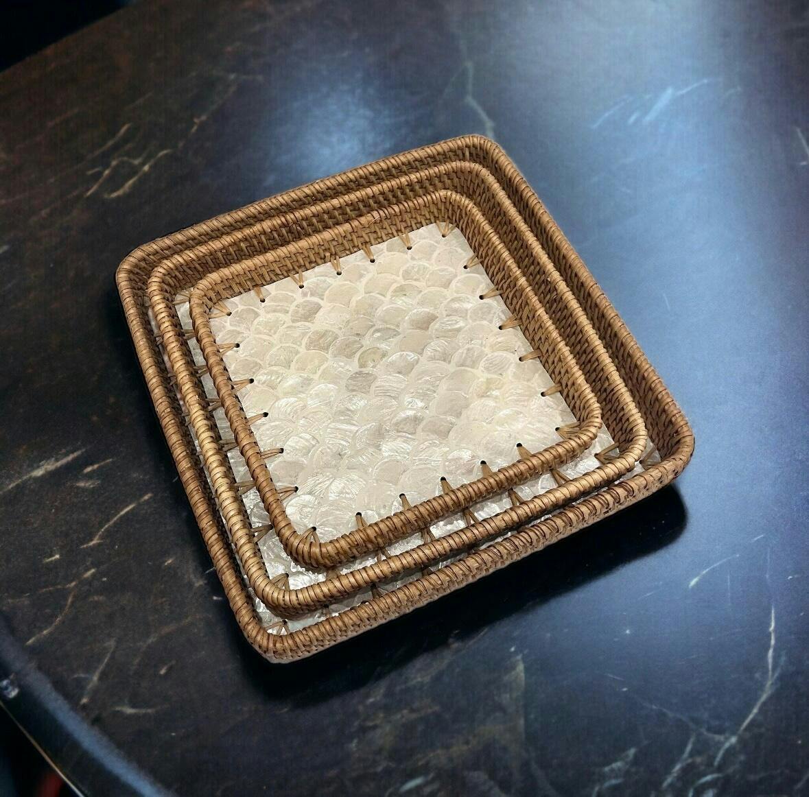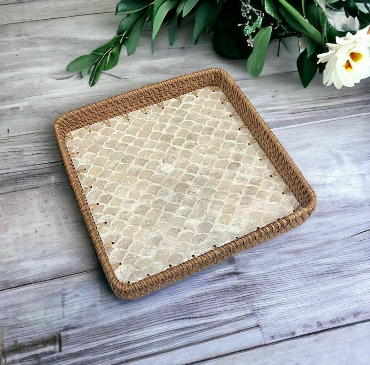 This unique fusion of natural rattan and lustrous mother of pearl inlay creates a stunning serving tray that's both functional and stylish. Perfect for serving appetizers or displaying decorative items, this rattan tray adds a touch of coastal charm to any space.